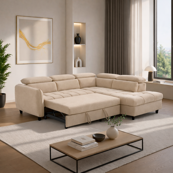 BRENDA δεξιός γωνιακός καναπές-κρεβάτι σε μπεζ αδιάβροχο ύφασμα
