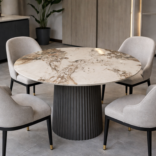 KEVIN τραπέζι 150εκ σε άσπρη-καφέ γυαλιστερή κεραμική επιφάνεια και γκρίζα ξύλινη βάση