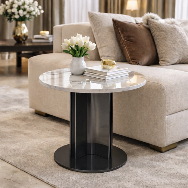 LAURA βοηθητικό τραπεζάκι σε άσπρη γυαλιστερή κεραμική επιφάνεια και γκρίζα βάση από ανοξείδωτο ατσάλι