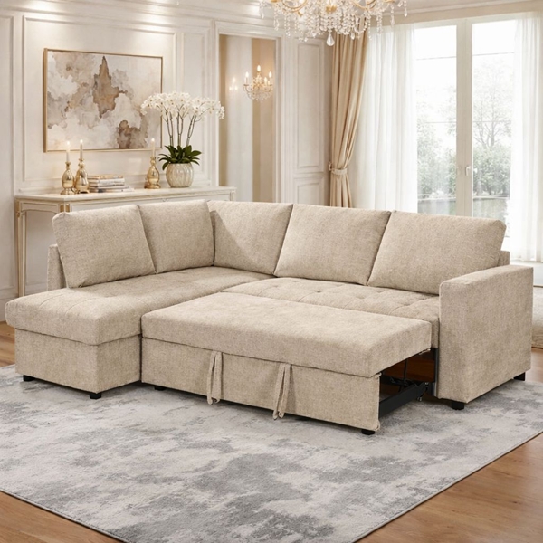 MARKELLA αριστερός γωνιακός καναπές-κρεβάτι σε beige αδιάβροχο ύφασμα