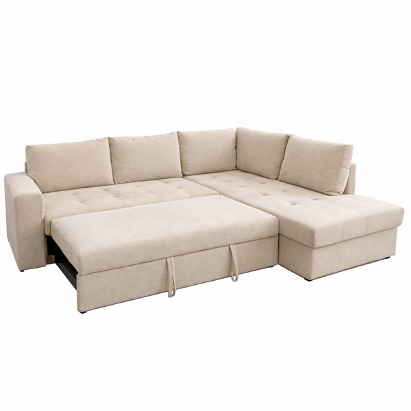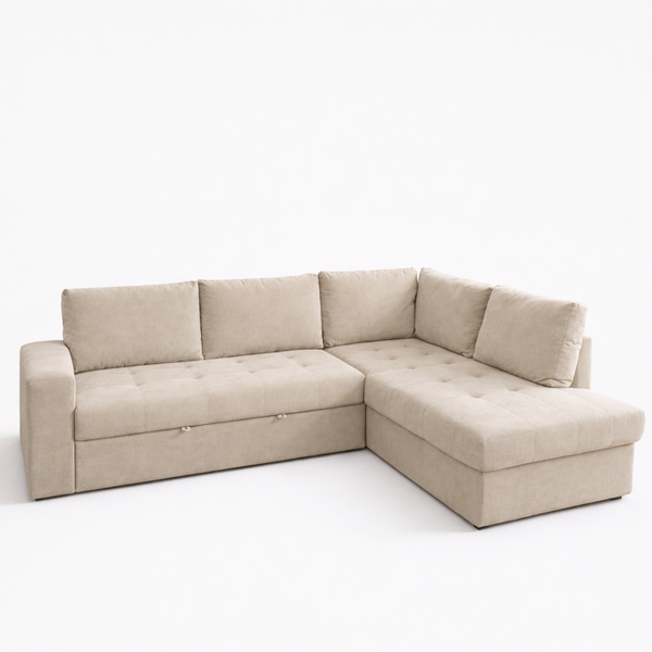 MARKELLA δεξιός γωνιακός καναπές-κρεβάτι σε μπεζ αδιάβροχο ύφασμα