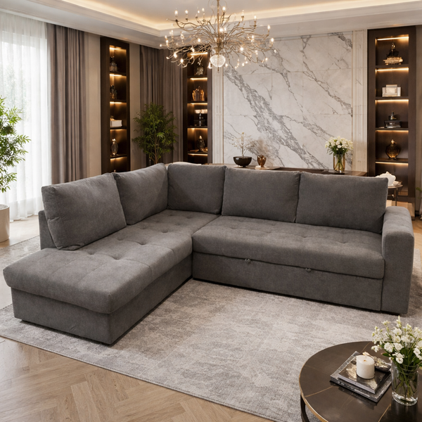 MARKELLA αριστερός γωνιακός καναπές-κρεβάτι σε γκρίζο αδιάβροχο ύφασμα