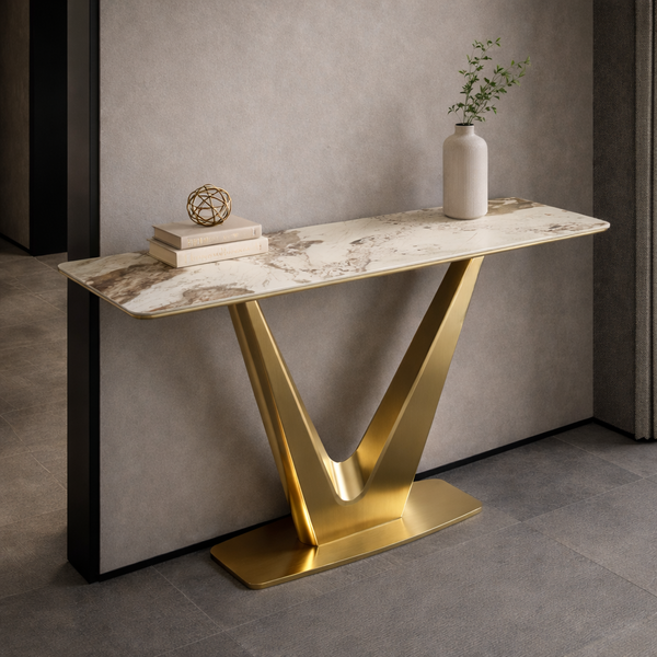 MYRANDA κονσόλα σε άσπρη-καφέ γυαλιστερή κεραμική επιφάνεια και χρυσή βάση απο ανοξείδωτο ατσάλι