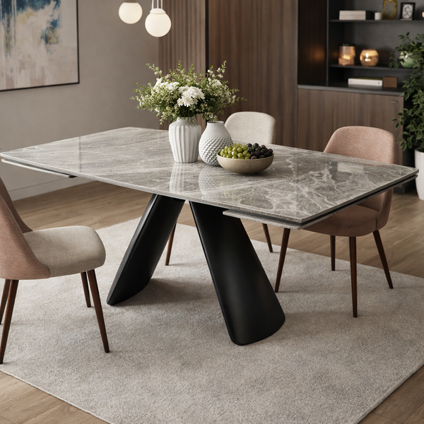 SANDRA επεκτεινόμενο τραπέζι σε γκρίζα γυαλιστερή κεραμική επιφάνεια και μαύρη ματ βάση