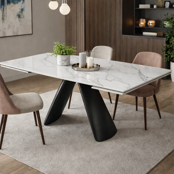 SANDRA επεκτεινόμενο τραπέζι σε άσπρη γυαλιστερή κεραμική επιφάνεια και μαύρη ματ βάση