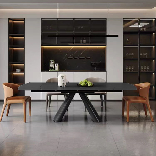 SANDRA ανοιγόμενο τραπέζι σε μαυρό ματ κεραμικό με πορτοκαλί γραμμές και μαύρη ματ βάση