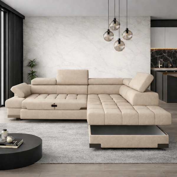 SELVA L δεξιός γωνιακός καναπές-κρεβάτι με αποθηκευτικό χώρο σε μπεζ ύφασμα