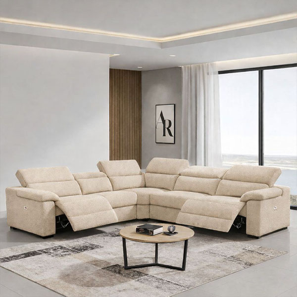 BARBARA corner sofa with 3 electric recliner seats in beige teflon fabric