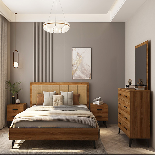 It includes a bed, 2pcs nightstands, chest of drawers and mirror.