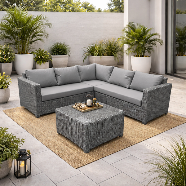 BOSTON outdoor corner and coffee table in gray wicker and gray textilene cushions