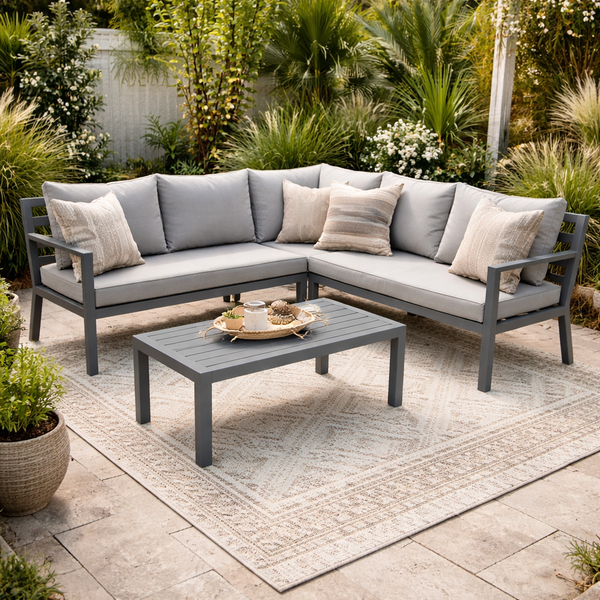 CALMA outdoor corner and coffee table in gray aluminium and gray textilene cushions