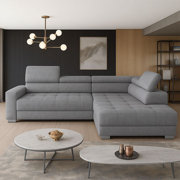 CAMPO (L) corner sofabed (right chaise longue) with electric recliner seat and gray fabric