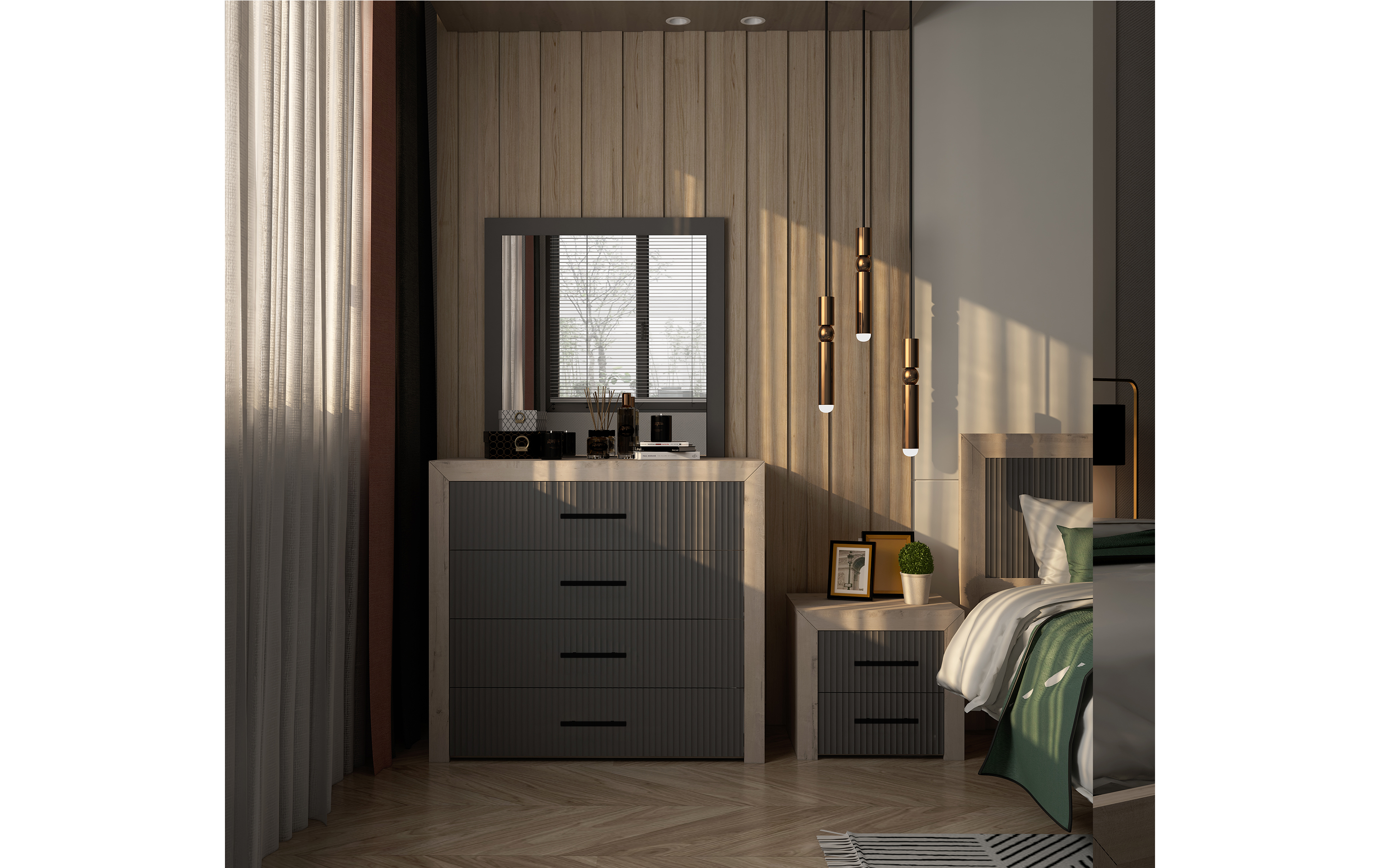 JEMMA chest-mirror in wild oak and gray waving melamine
