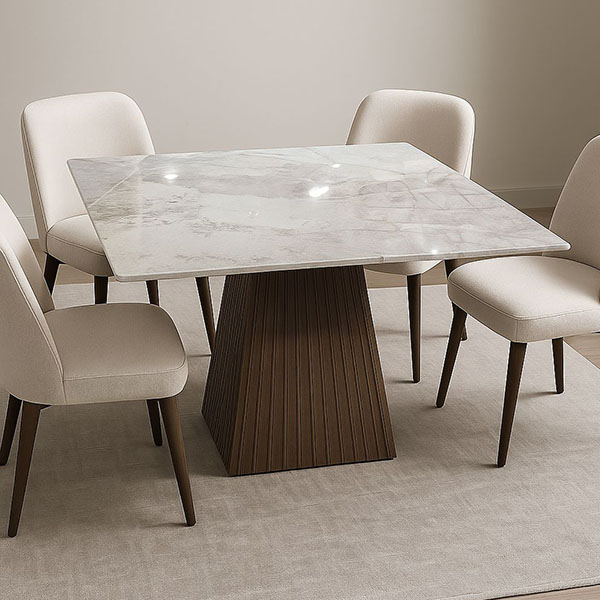 KEVIN TABLE 150x150cm IN WHITE-BROWN GLOSS CERAMIC AND WALNUT WOOD PANELS BASE