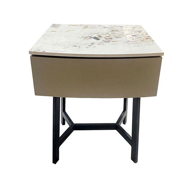 MELISSA bedside table in white-brown sintered stone, black matt base and champagne drawer