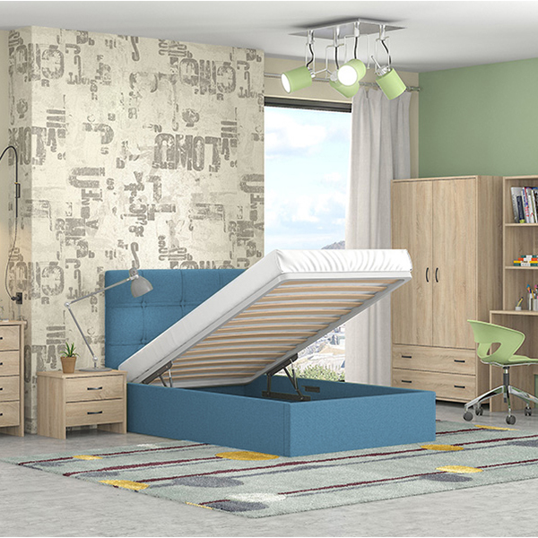N64 bed with storage in blue fabric. Mattress is sold separately.