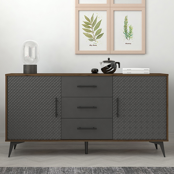 RAVEN BUFFET IN WALNUT MELAMINE AND GRAY DIAMOND DOORS WITH BLACK HANDLES