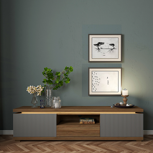 REBECCA TV STAND WITH LED IN WALNUT MELAMINE AND GRAY WAVING MELAMINE