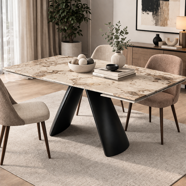 SANDRA extendable table in white-brown gloss ceramic and black matt base