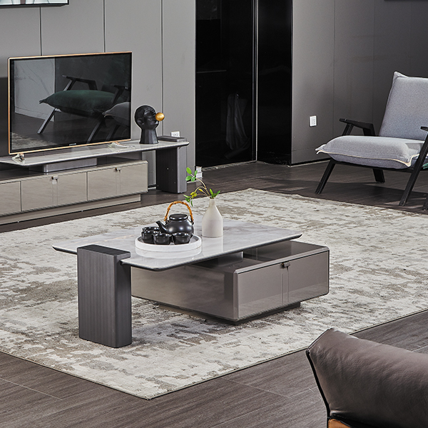 STEPHANY coffee table in gray gloss sintered stone ceramic and gray brushed drawer