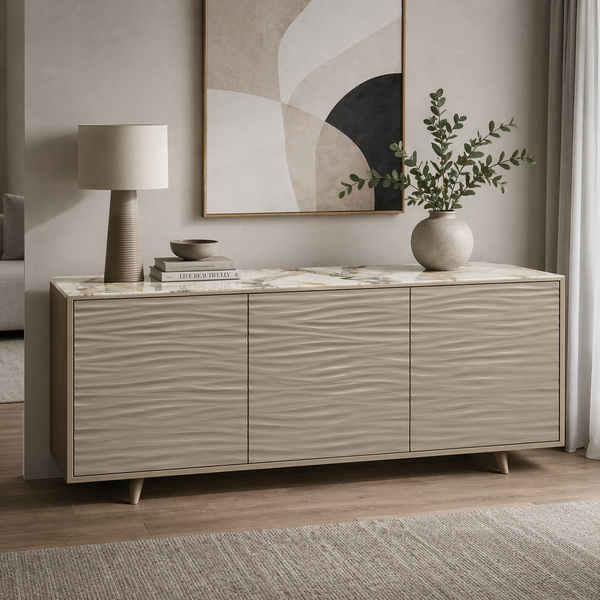 AMBRA μπουφές σε μπεζ με γκρίζες γραμμές κεραμική επιφάνεια και σαμπανί ματ βάση