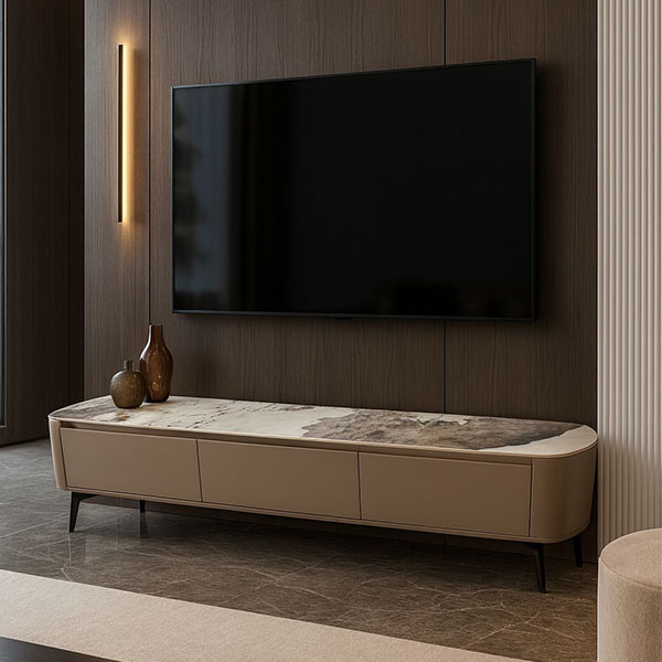 ERICA έπιπλο τηλεόρασης σε άσπρο-καφέ γυαλιστερό κεραμικό, champagne κορμό και μαύρη βάση