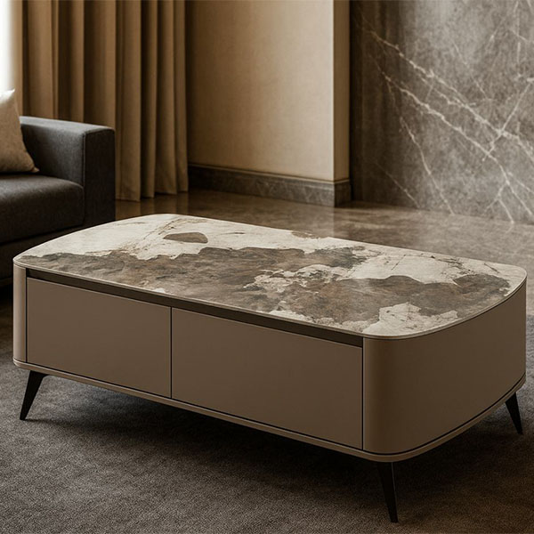 ERICA τραπεζάκι σαλονιού σε άσπρο-καφέ γυαλιστερό κεραμικό, champagne κορμό και μαύρη βάση