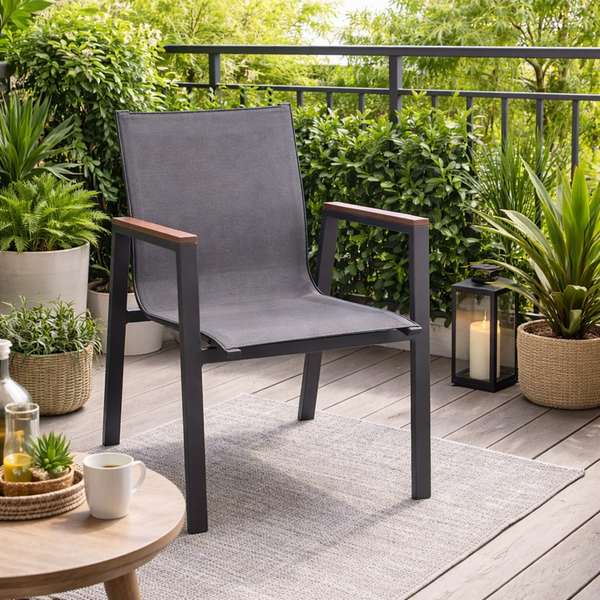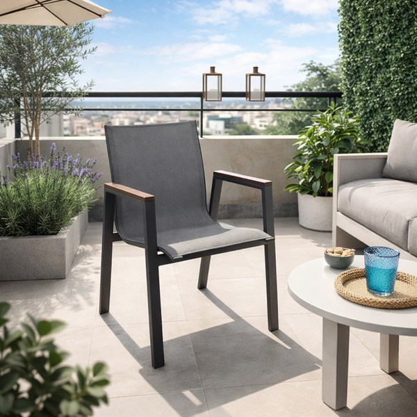 FIDDLE καρέκλα σε γκρίζο αλουμίνιο, γκρίζο textilene και teak wood λεπτομέρεια στις αγκώνες