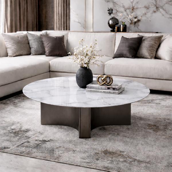 LAURA τραπεζάκι σε άσπροη γυαλιστερή κεραμική επιφάνεια και γκρίζα βάση από ανοξείδωτο ατσάλι