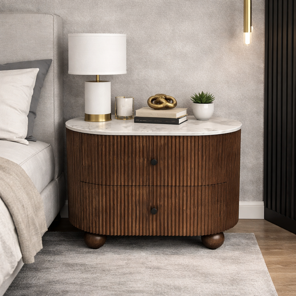 LITSA κομοδίνο σε άσπρο-καφέ γυαλιστερό κεραμικό και βάση mdf καρυδιάς χρώματος ξύλου
