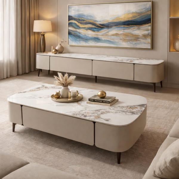 ALECA TV STAND IN BEIGE WITH BROWN CERAMIC, GRAY-BEIGE BASE AND BLACK LEGS
