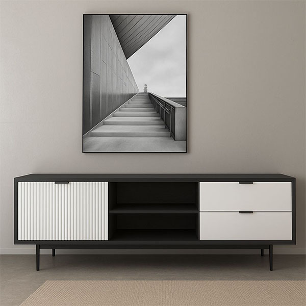 BLANCA TV STAND IN CEMENT AND WHITE WAVING MELAMINE