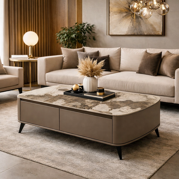 ERICA coffee table in white-brown gloss ceramic, champagne body and black base