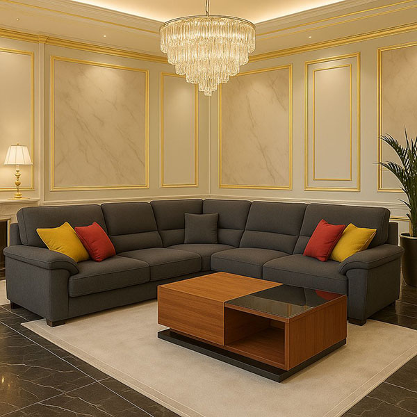 LARISSA corner sofa with pocket springs in gray teflon fabric and black legs