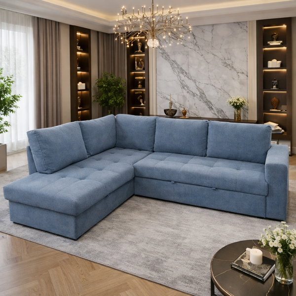 MARKELLA LEFT CHAISE LONGUE CORNER SOFABED IN BLUE TEFLON FABRIC
