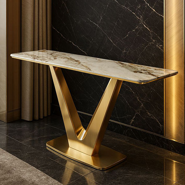 MYRANDA CONSOLE IN WHITE-BROWN GLOSS CERAMIC AND GOLDEN STAINLESS STEEL BASE